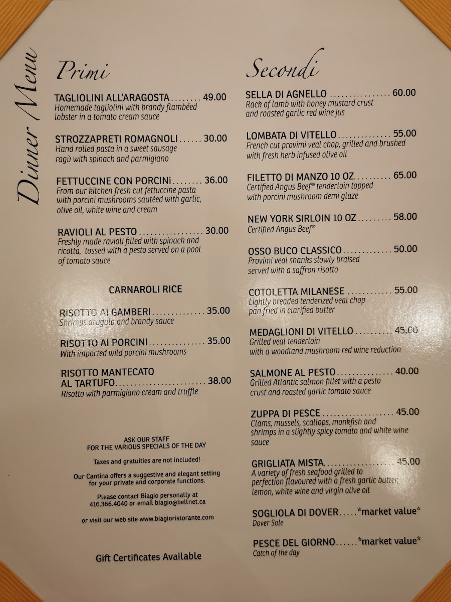 Welcome to Biagio Ristorante, a culinary gem nestled in the heart of downtown Toronto. Known for its authentic Italian cuisine, Biagio offers a menu that captivates the senses with each dish crafted meticulously. Start your meal with the Carpaccio di Manzo, a delightful assembly of certified Angus beef, arugula, and truffle essence that promises to awaken your palate. For seafood lovers, the Frittura del Pescatore presents a heavenly combination of calamari, shrimp, and smelts in a spiced tomato sauce.